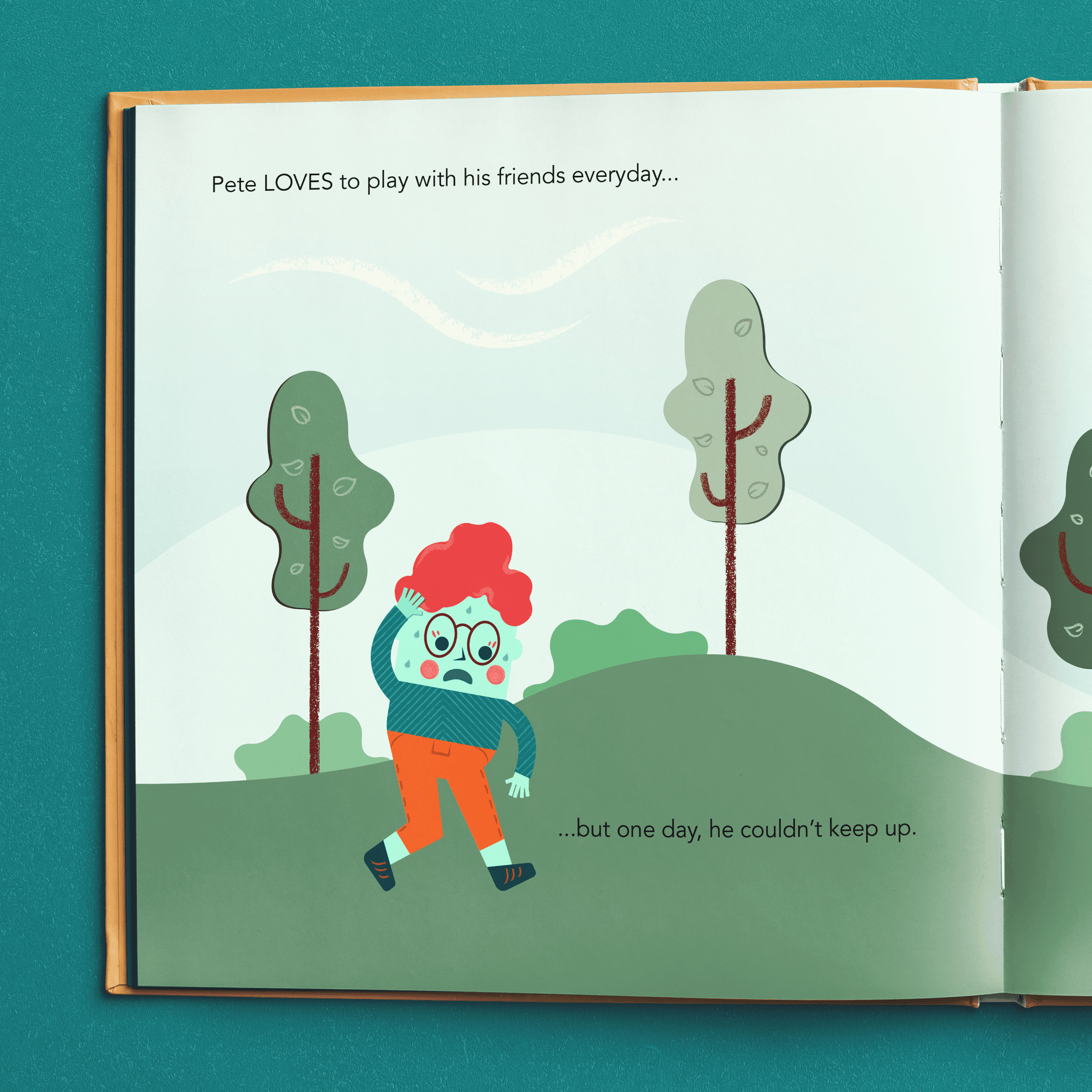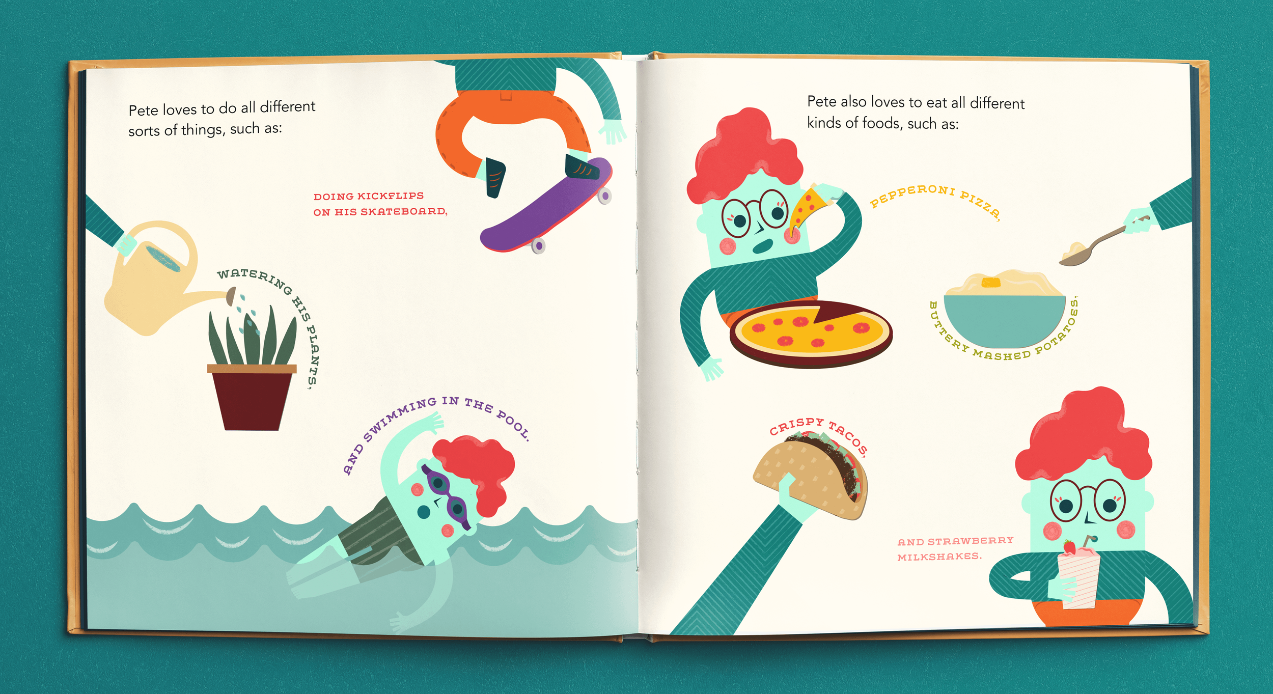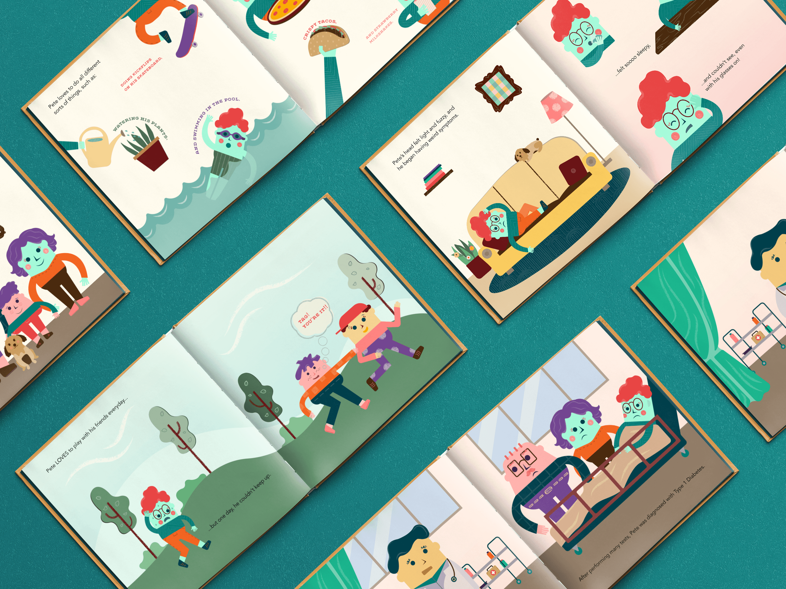 Creating the main character, Sweet Pete, was one of my first steps in building the storyline and developing an environment that matched the design of the characters. I wanted to create a main character that reflected human-like features, while also incorporating an eccentric color palette for the skin, hair, eyes, eyebrows, etc. Above are some of Pete’s facial expressions that he uses to portray his feelings of happiness, worry/concern, and sleepiness, which provide the reader a look into Pete’s personality and how he expresses his emotions. The details on his face, such as his glasses, rosy cheeks, and puffy hair are all unique details that are memorable to someone reading this story. Overall, creating Sweet Pete, along with the other characters, created a foundation in constructing the entirety of this story.